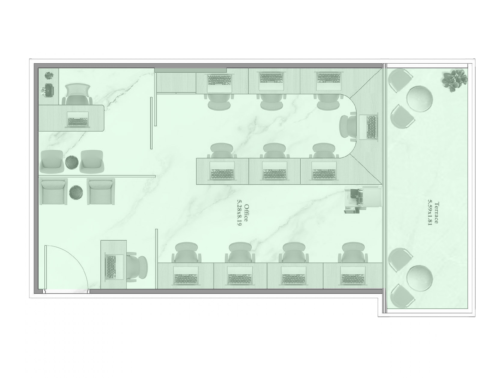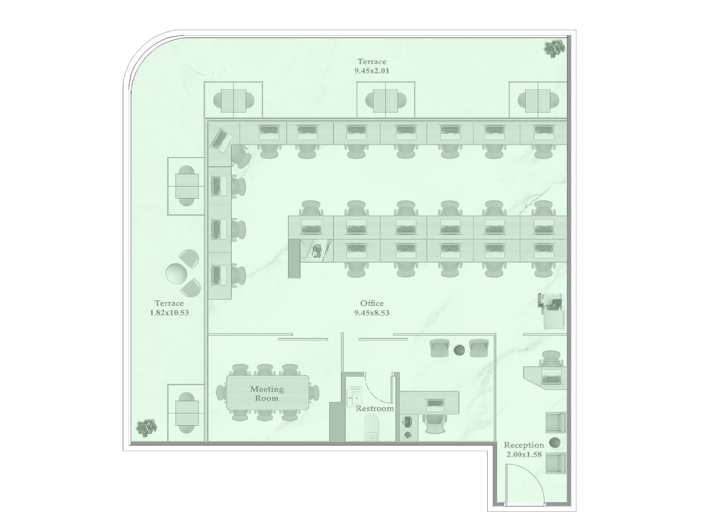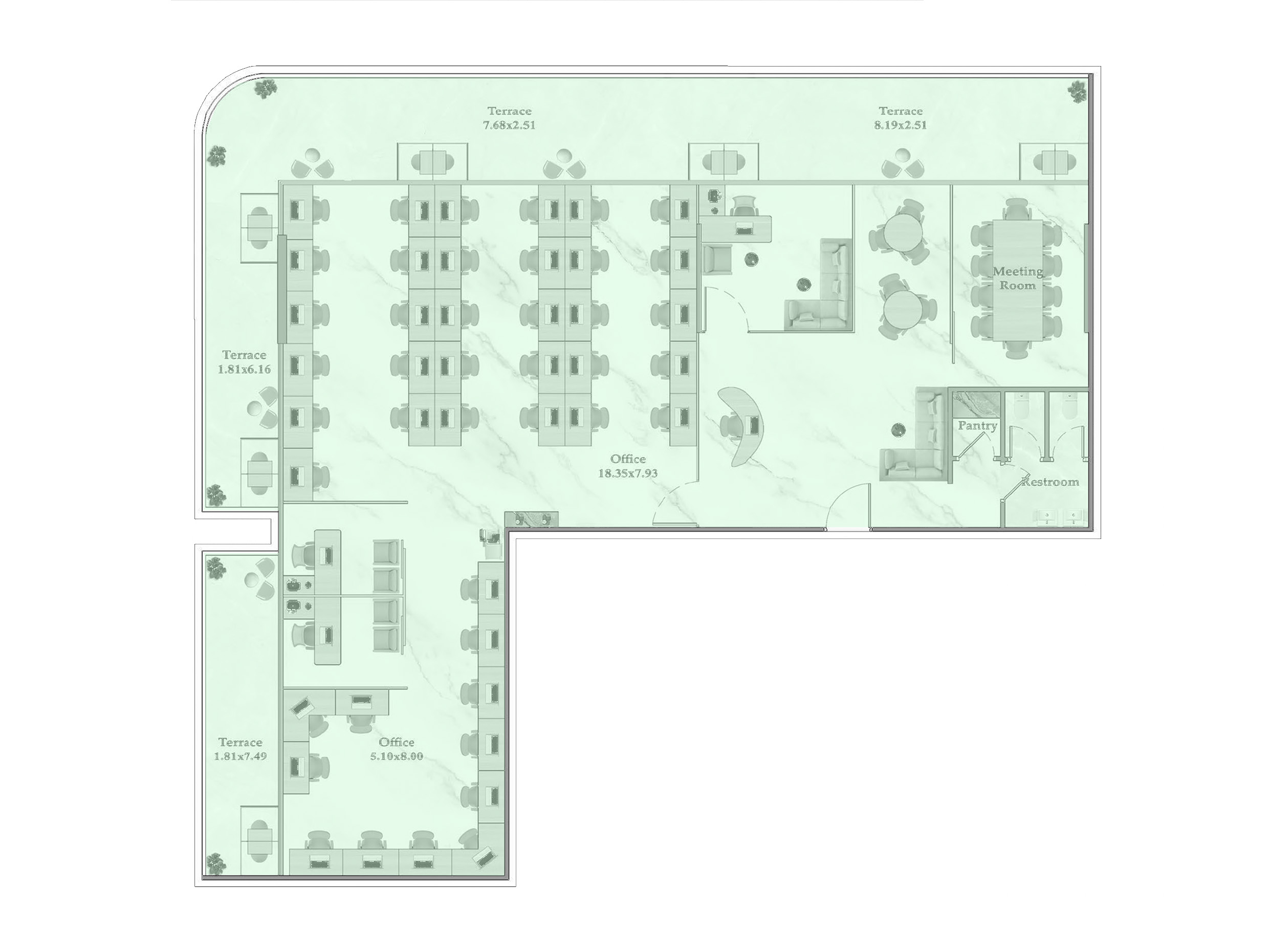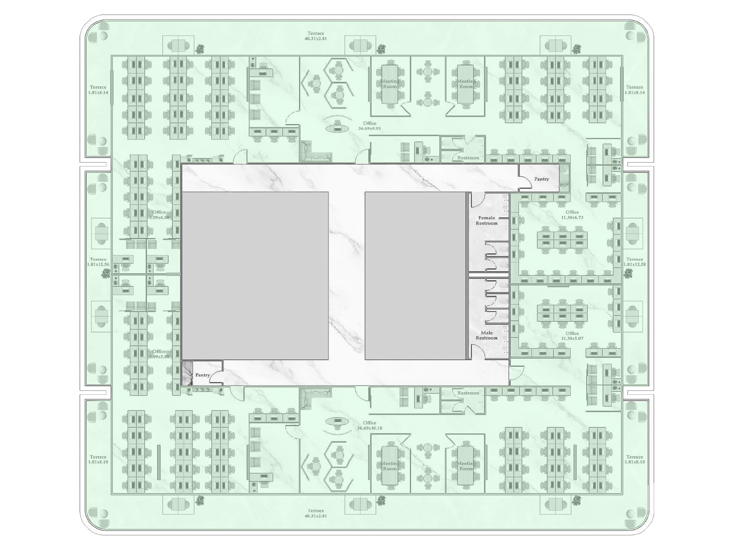 - Open terraces and integrated sky gardens that bring greenery into the work environment